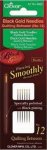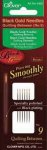 Velvety smooth, sharp point is polished along the axis for effortless piercing - offers 30% less friction than conventional hand sewing needles. Black-plating enhances rust resistance. Long lasting. Made of stainless steel. Gold Eye. 6 needles/package.